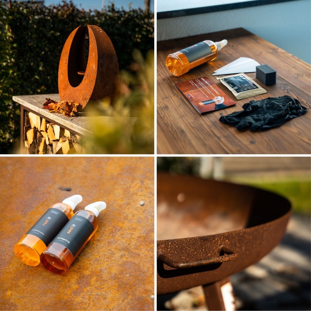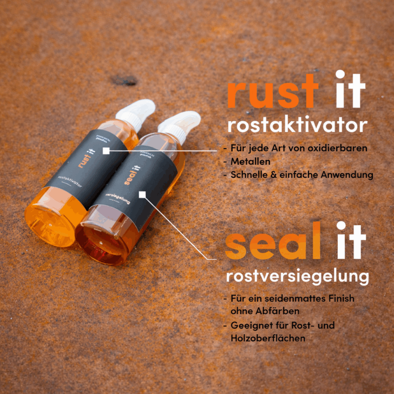 SealIT schützt oxidierte Metalloberflächen zuverlässig und dauerhaft. Die Versiegelung wird einfach auf die trockene Rostfläche aufgesprüht und konserviert exakt den aktuellen Rostzustand – ganz gleich, ob die Patina leicht entwickelt oder bereits intensiv ausgeprägt ist. So bestimmst Du selbst, wie stark der Rostcharakter sein soll. SealIT reduziert Abfärben, schützt vor Feuchtigkeit und verleiht der Oberfläche ein gleichmäßiges, seidenmattes Finish mit kräftigen Farben.